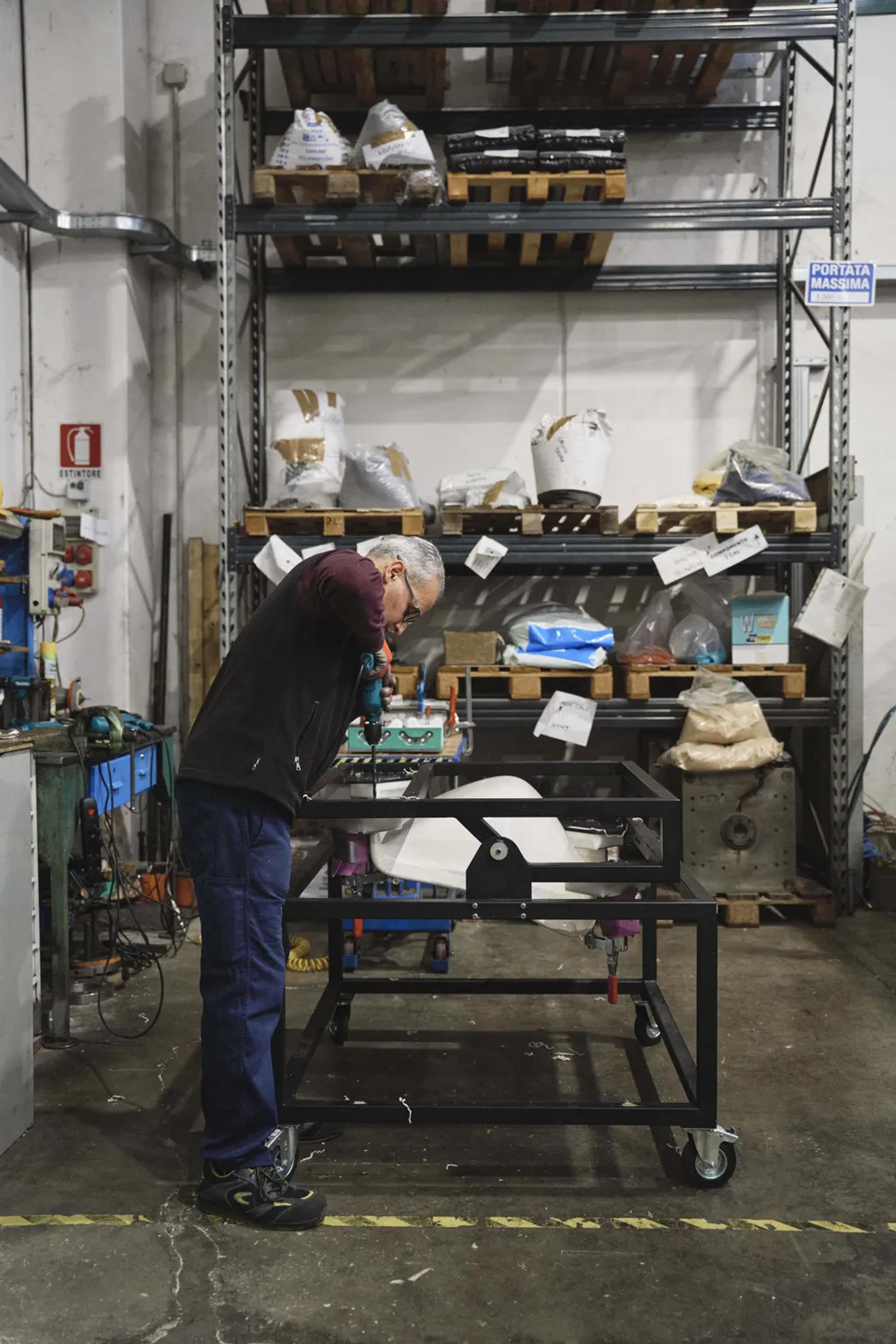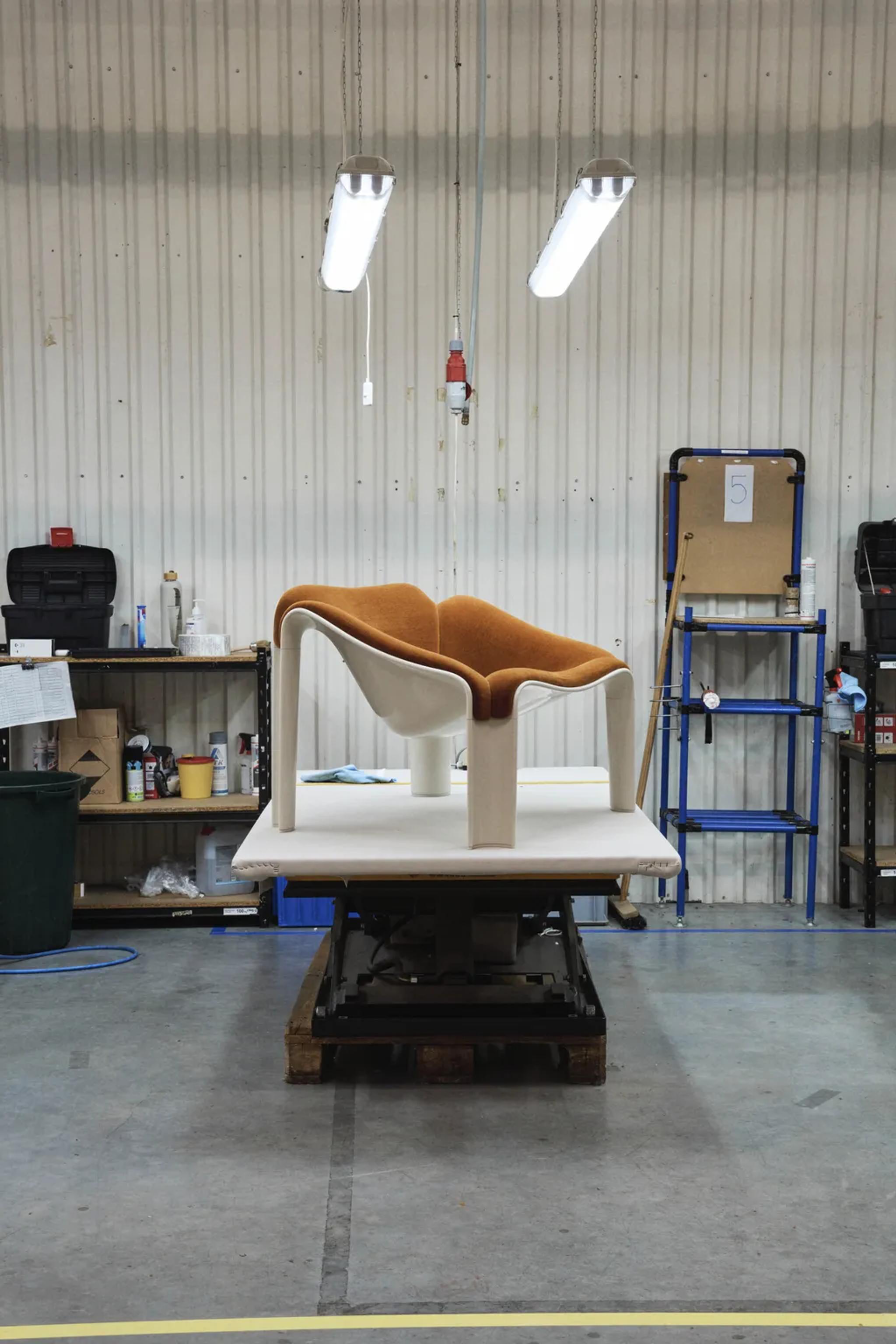 Переизданное кресло ‘F300’ производится по строго контролируемому пятиэтапному процессу. Всё начинается с гранул HiREK, которые плавятся и впрыскиваются в формы, создавая сиденье, переднюю и заднюю ножки — каждая деталь спроектирована так, чтобы усиливать зоны нагрузки и при этом сохранять лёгкий, скульптурный силуэт кресла.