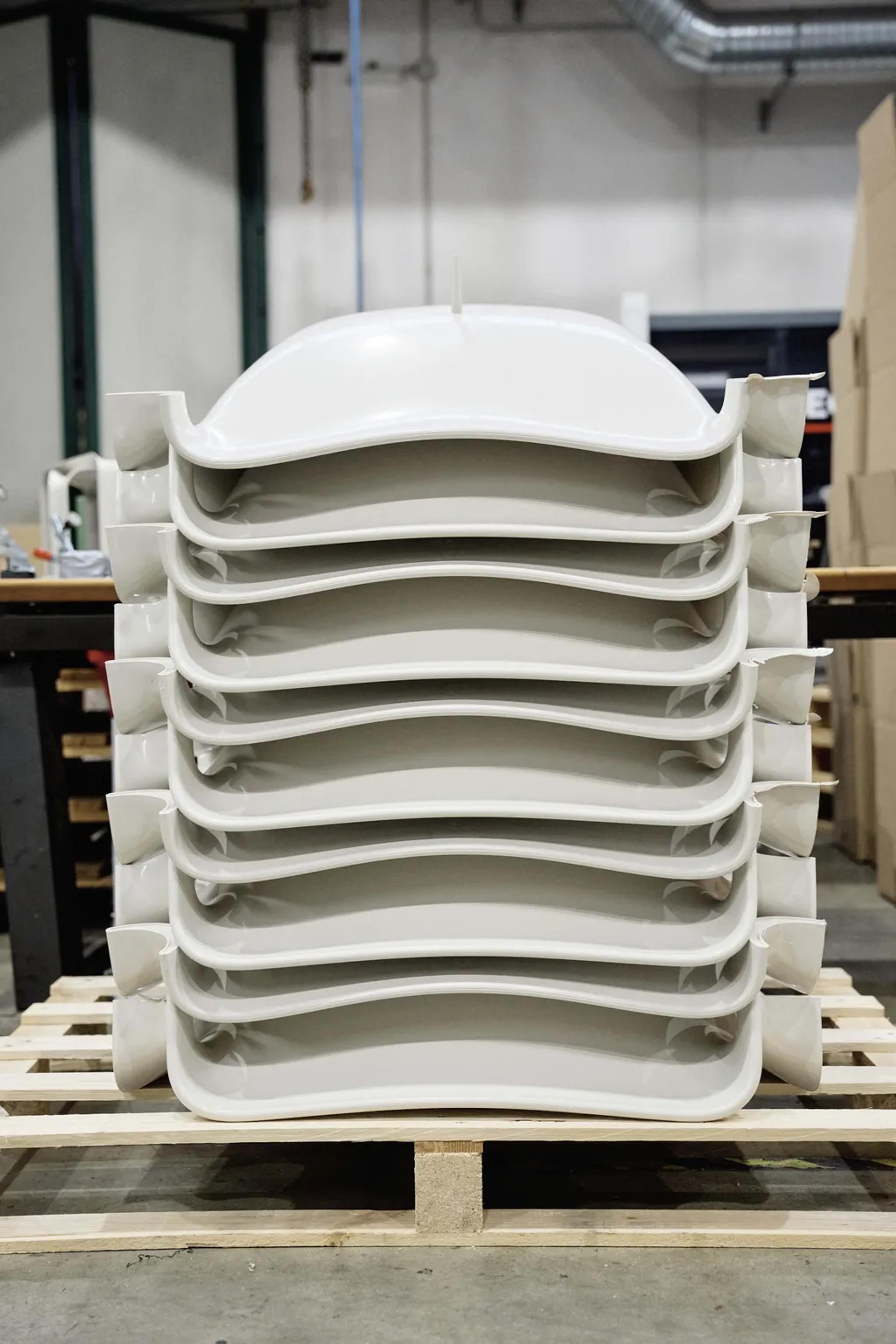 После формования элементы дорабатываются вручную: их обрезают, шлифуют с использованием специализированных керамических инструментов и оставляют на 24 часа для стабилизации термопластика.