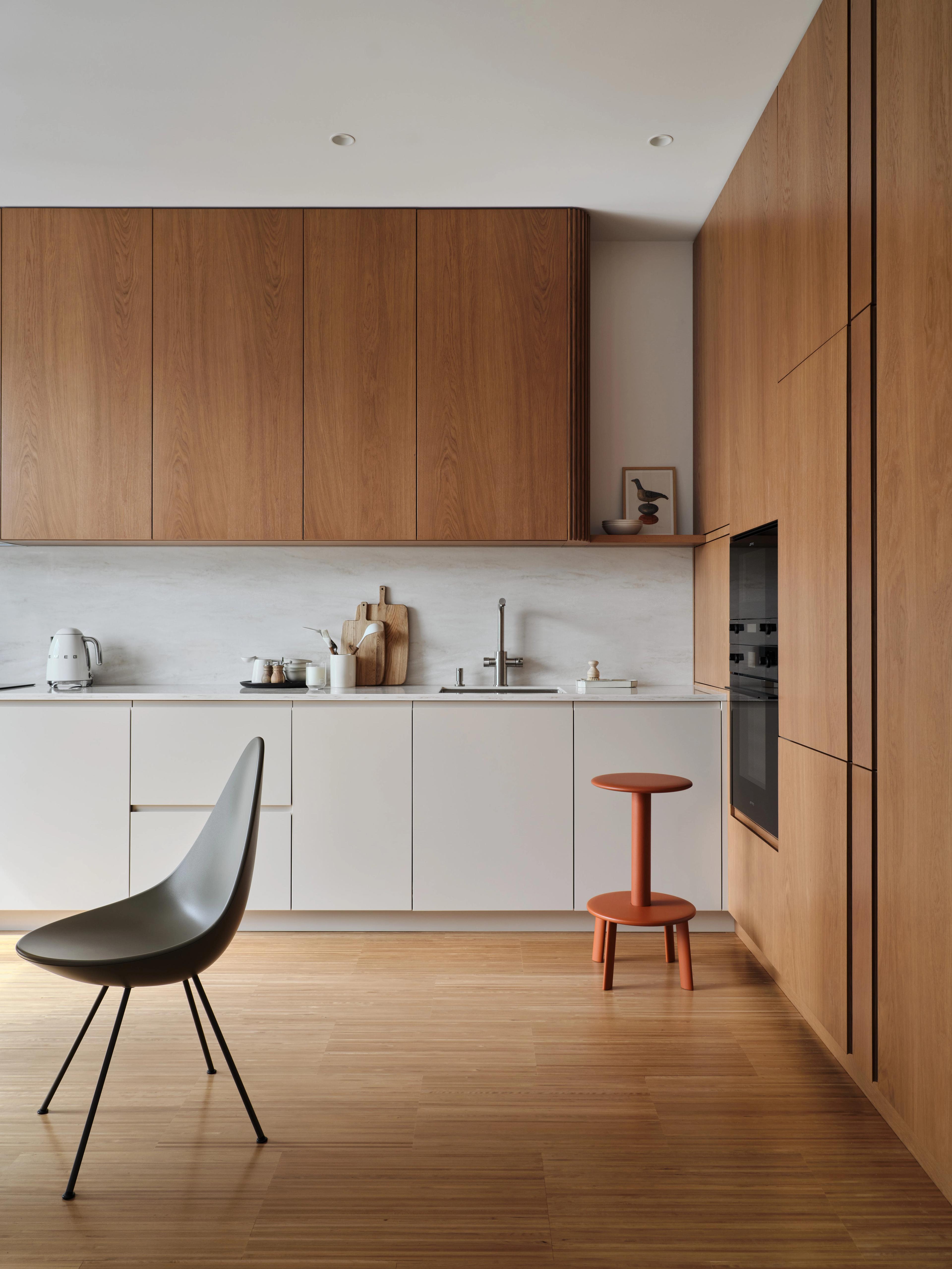 На кухне — стол Fabbi Mobili и полубарный табурет Massif от Anderssen & Voll для &Tradition; подвесной светильник PH 5, разработанный Паулем Хеннингсеном для Louis Poulsen, сочетается со стульями Drop от Fritz Hansen по дизайну Арне Якобсена.