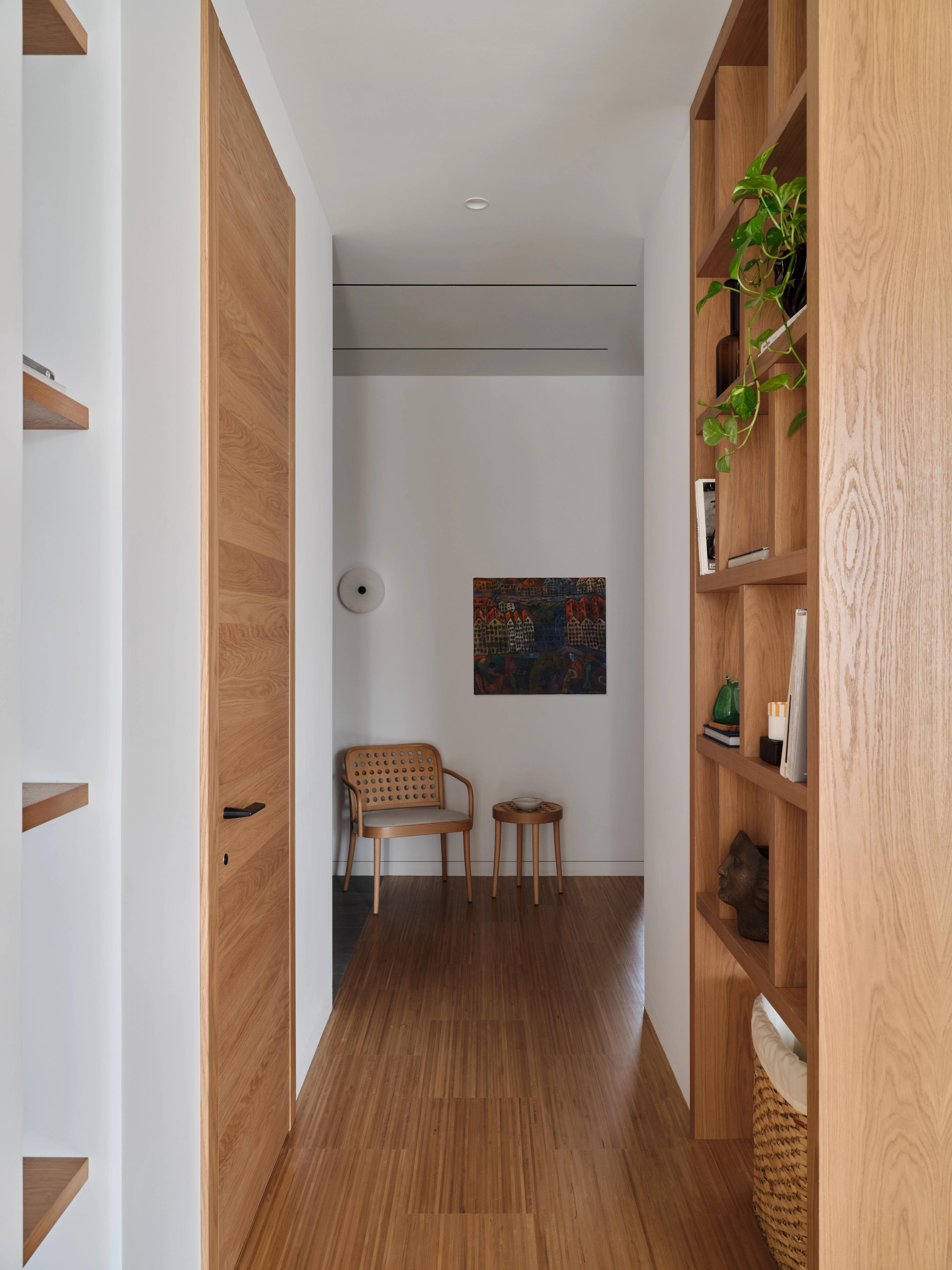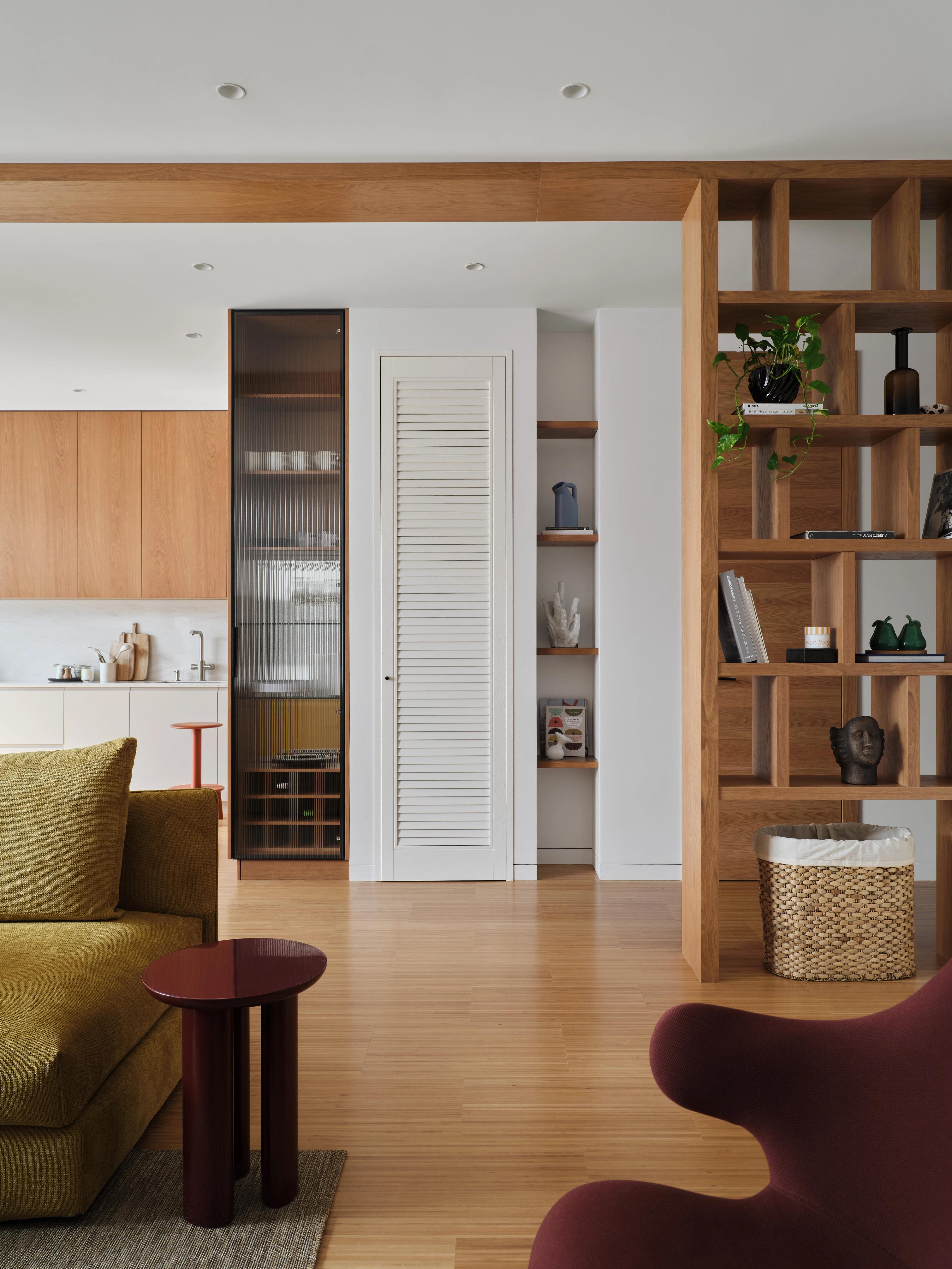 Гостиная визуально отделяется от кухни-полуострова и прихожей П-образной конструкцией — сквозным стеллажом в полный рост. Этот элемент придаёт входной зоне представительность, не утяжеляя её, и одновременно решает сугубо практическую задачу: хозяева — страстные книголюбы с обширной библиотекой.