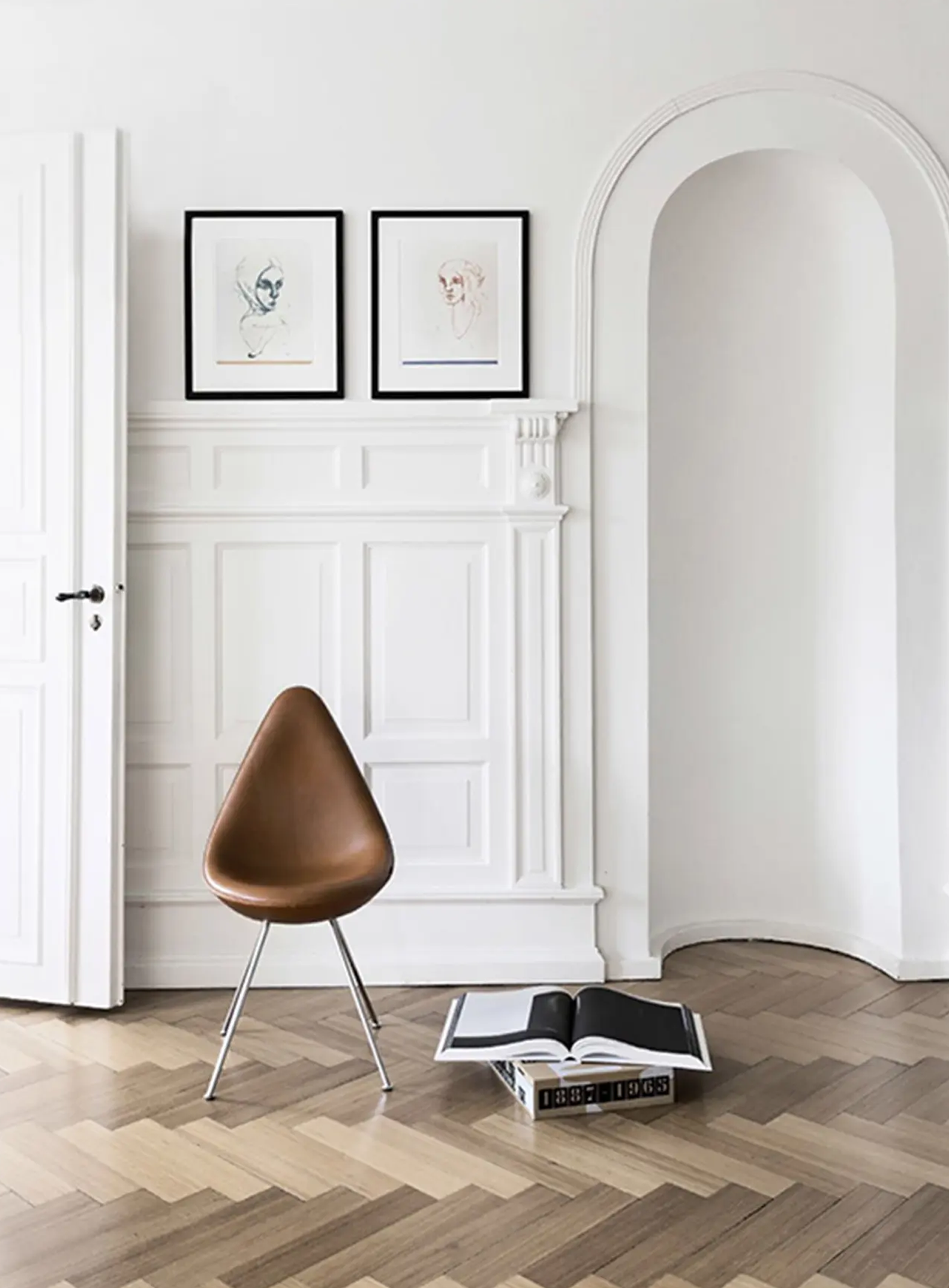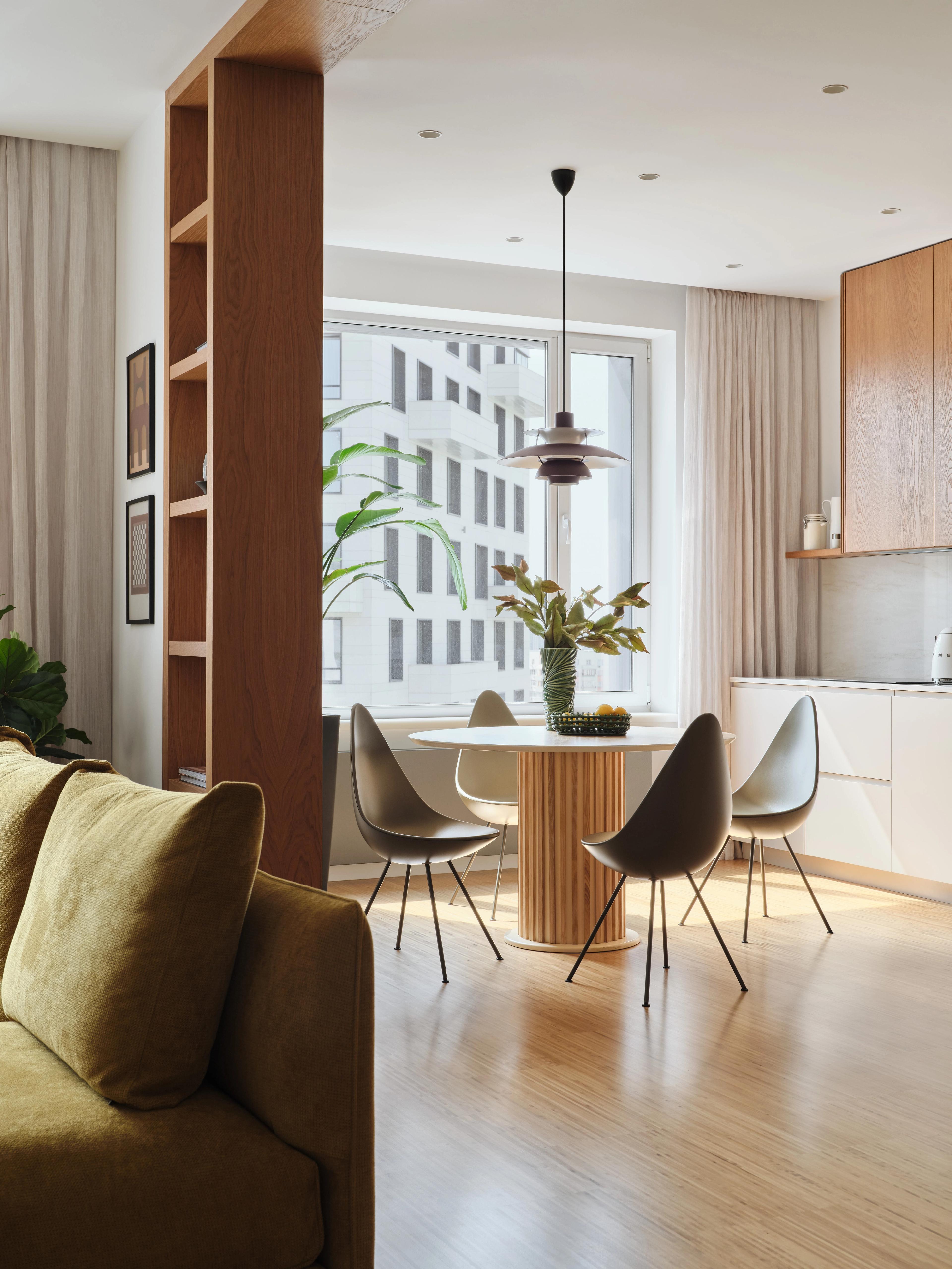 Значительная часть мебели ориентирована на вневременной дизайн: пара планирует когда-нибудь переехать в более просторное жильё и взять эти вещи с собой — как часть собственной истории. В интерьере преобладают датские марки — Fritz Hansen, Louis Poulsen, &Tradition, Gubi, — известные приверженностью качеству и долговечности решений. Среди знаковых предметов — подвесной светильник PH 5, разработанный Паулем Хеннингсеном для Louis Poulsen в 1958 году, и стулья Drop Арне Якобсена, созданные для отеля SAS Royal.