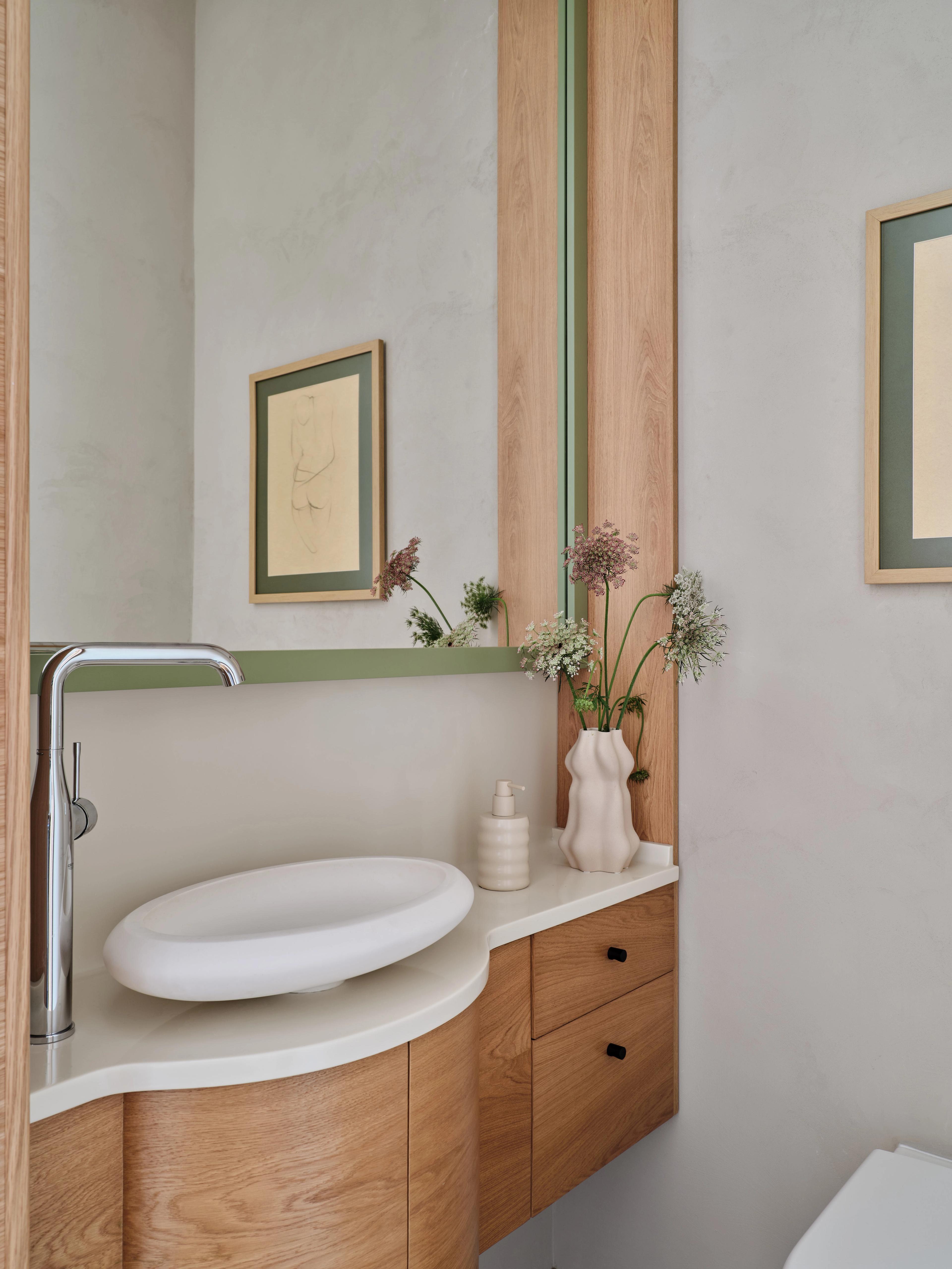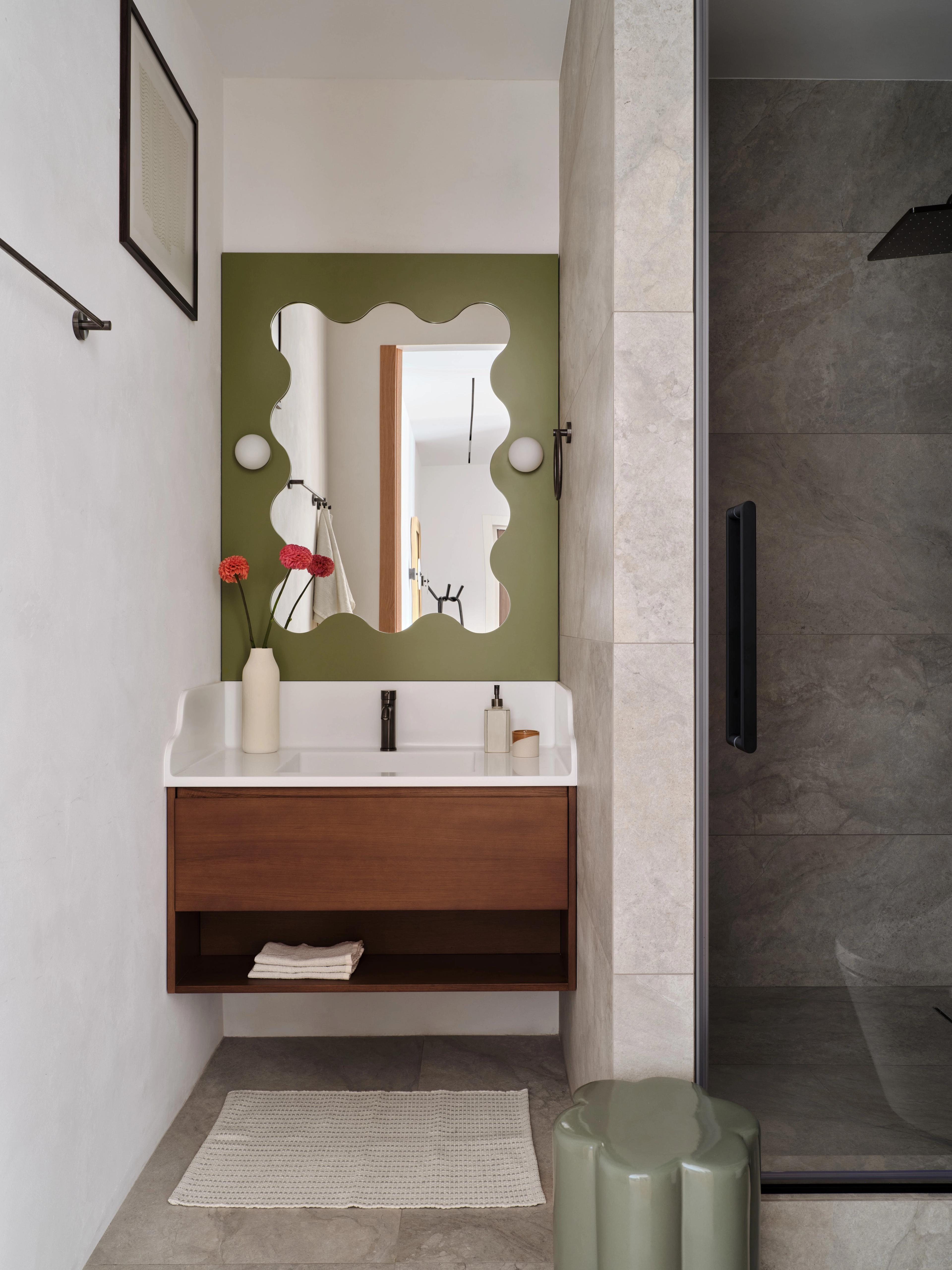 Тумба с раковиной и зеркало изготовлены на заказ в столярной мастерской Valesco; смесители и аксессуары — Grohe, керамический табурет — La Redoute, покрытие из керамогранита — Imola Ceramica.