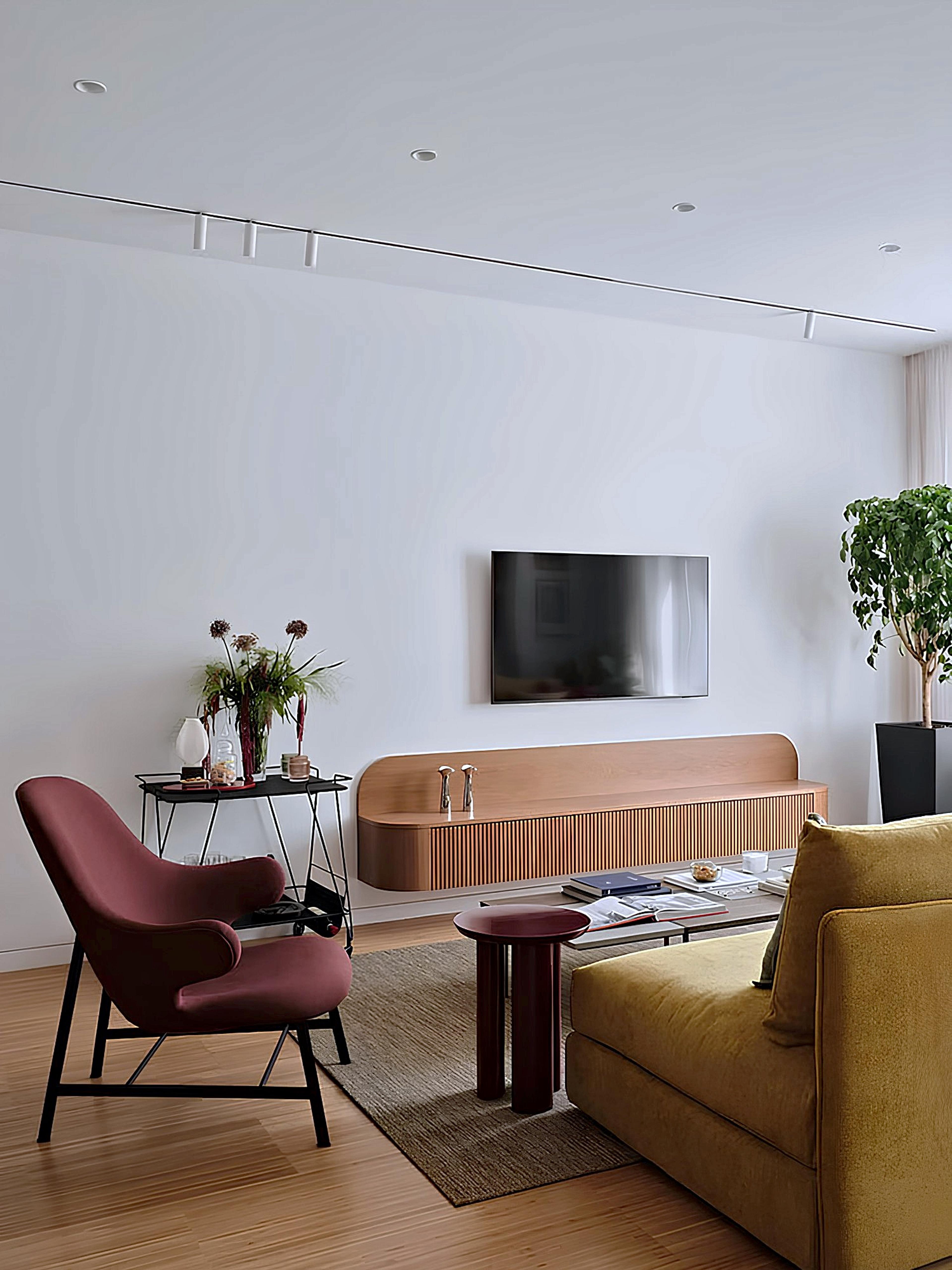 Диван клиентов, перетянутый специально для этого проекта, дополнен креслом Catch JH13 от &Tradition, журнальным столиком Tung от &Tradition и барной тележкой Mategot от Gubi; рабочее кресло Elephant Leather от Norr11, приставной столик Stijl от Arketipo, настольная лампа Panthella 160 от Louis Poulsen и работа «Уличные музыканты» казахстанского художника Аскара Есдаулета завершают пространство.