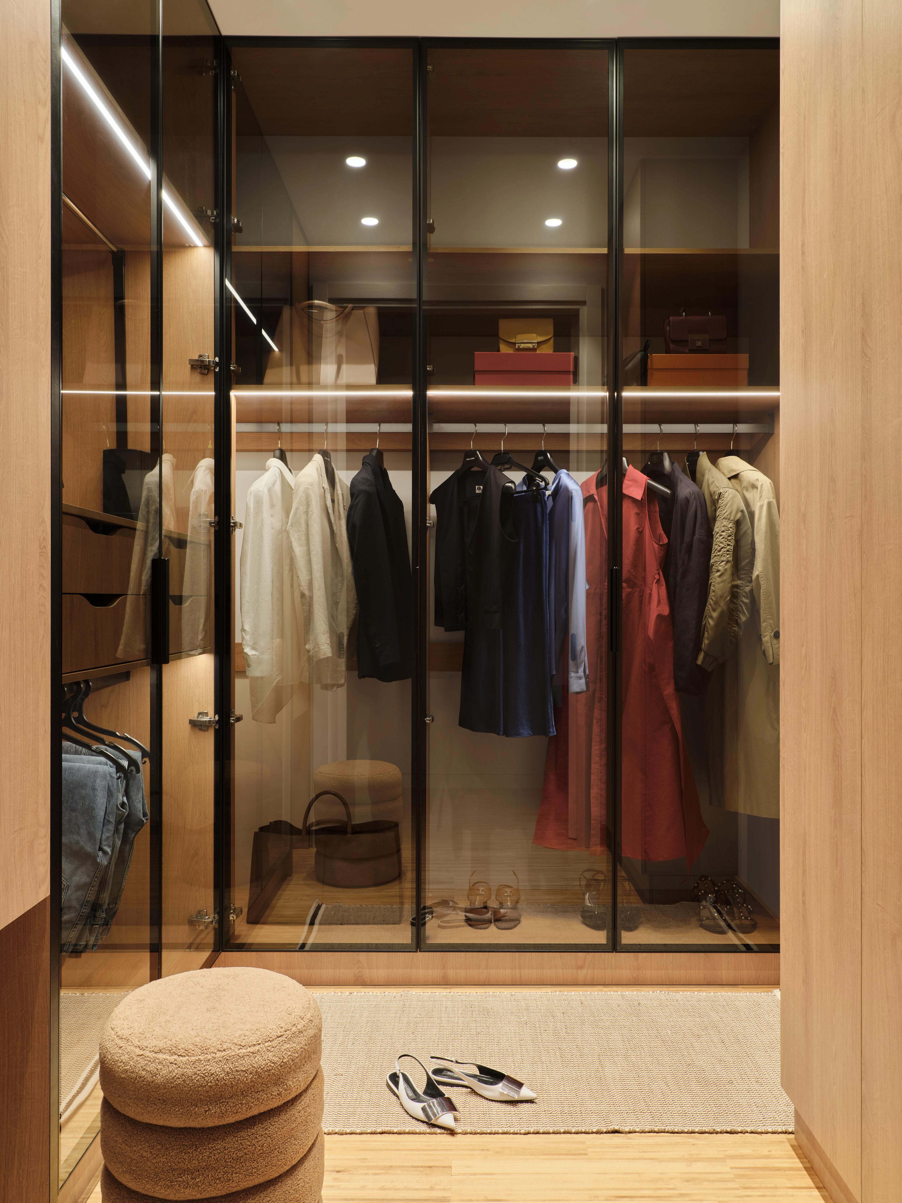 Шкафы гардеробной изготовлены на заказ в столярной мастерской Valesco; пуф и ковёр — La Redoute.