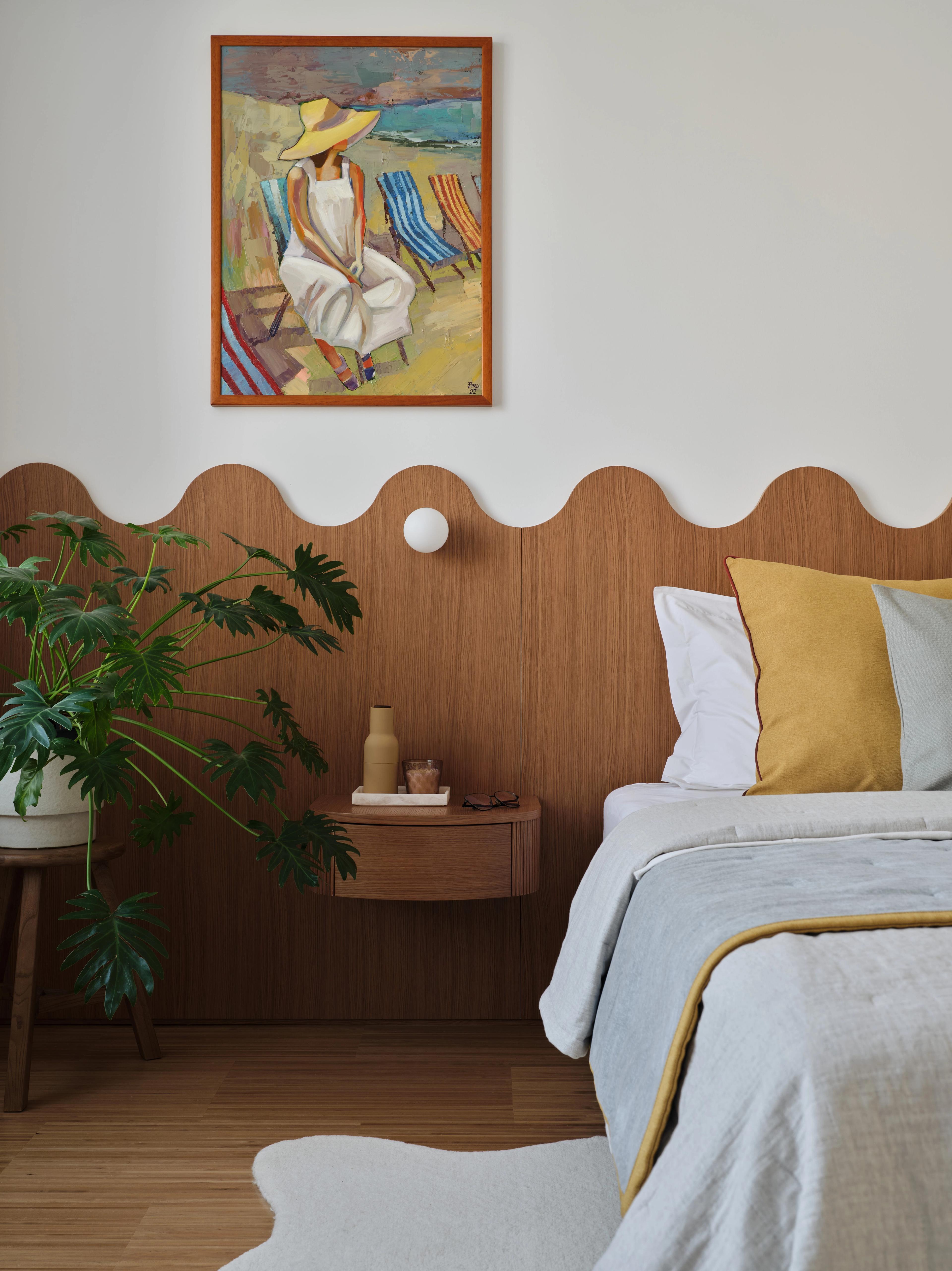 В спальне изголовье кровати с навесными прикроватными тумбами выполнено на заказ в столярной мастерской Valesco, основание кровати — Atticus; кресло и ковёр — La Redoute, бра — Ideal Lux, торшер Gräshoppa от Gubi. Интерьер завершает работа казахстанской художницы Айгуль Бейсеновой.
