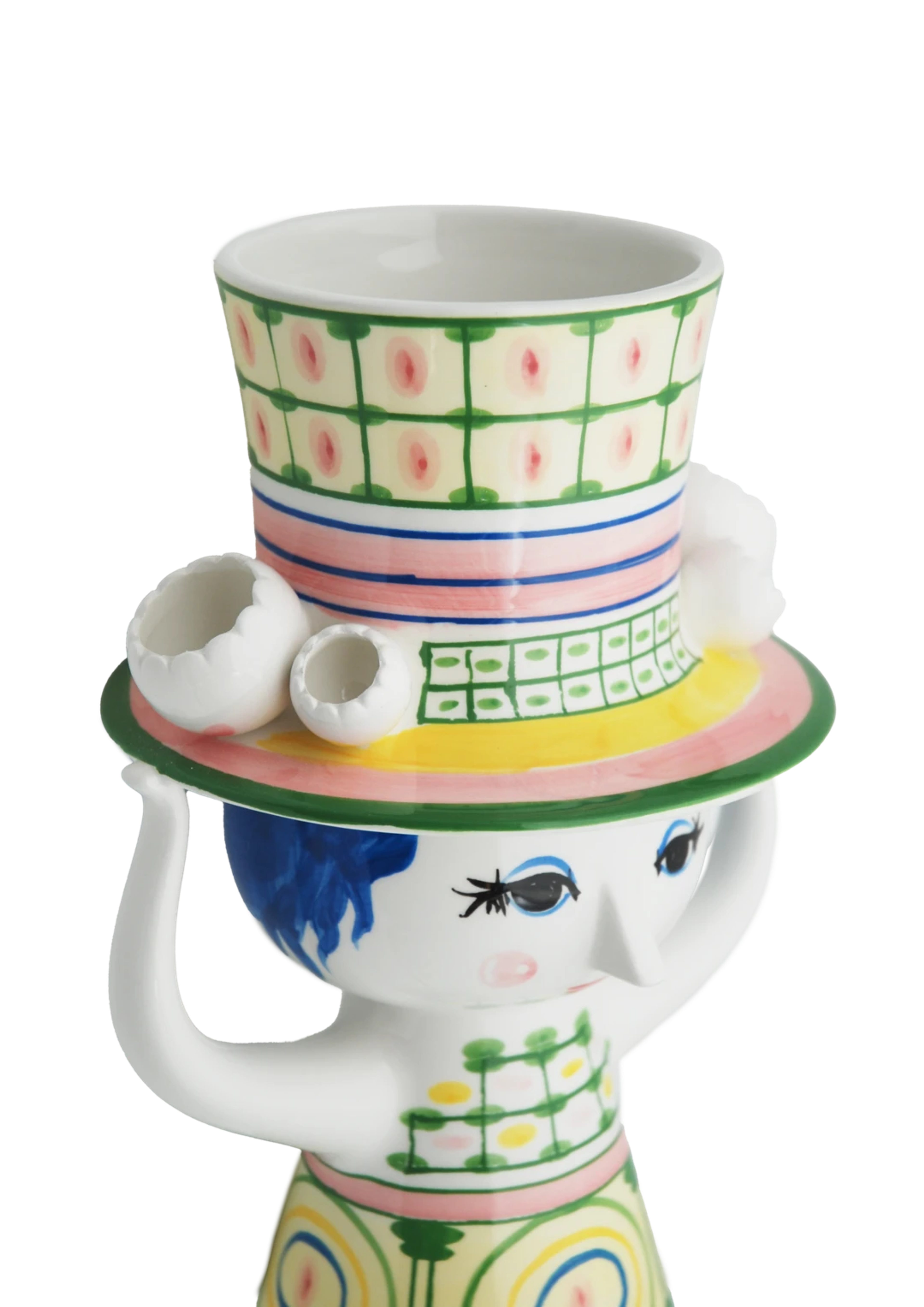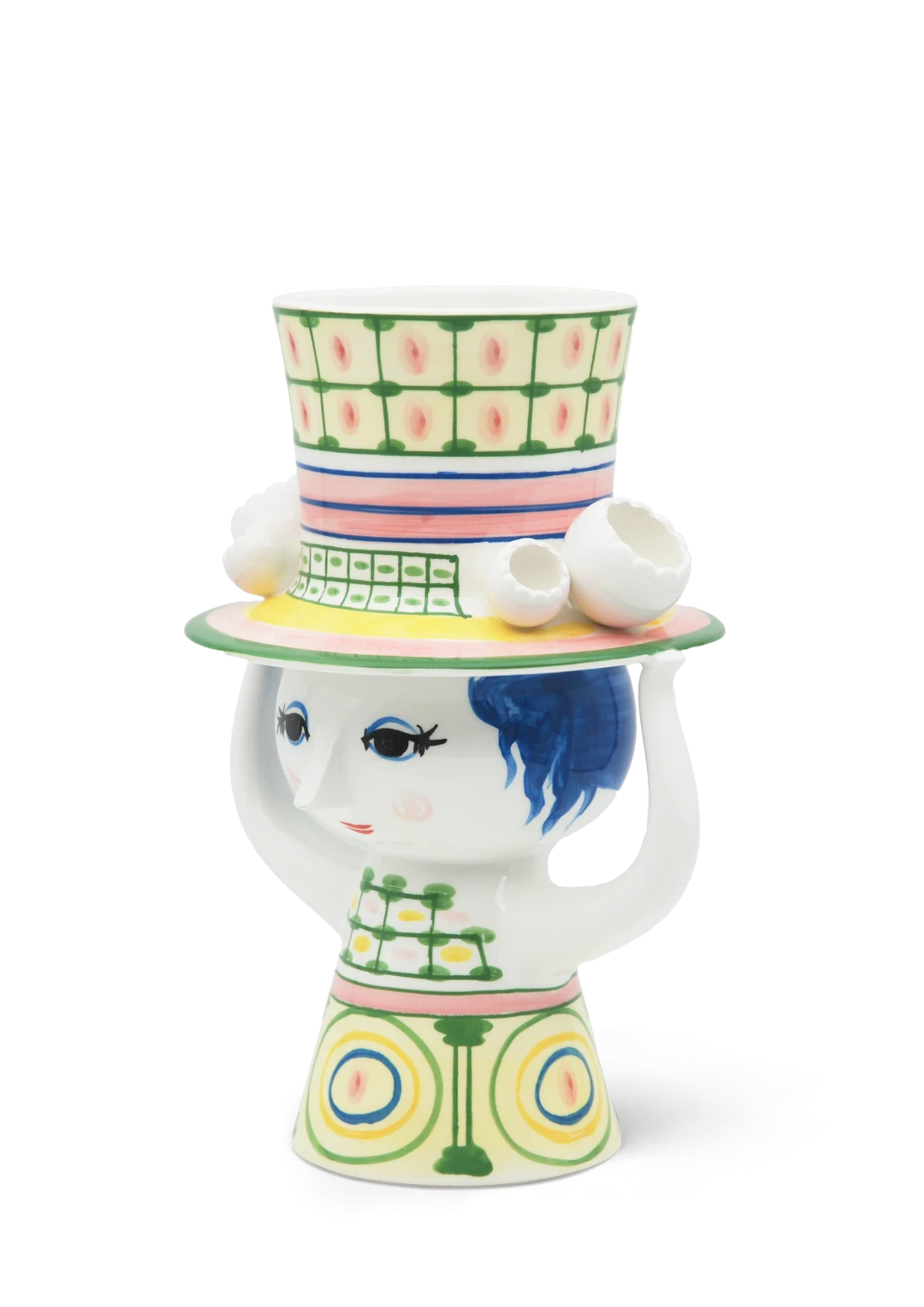 Ваза из блестящей глазурованной керамики высотой 24,5 см, где преобладает зеленый цвет, а геометрические круги юбки прекрасно контрастируют с клетчатым узором шляпы.